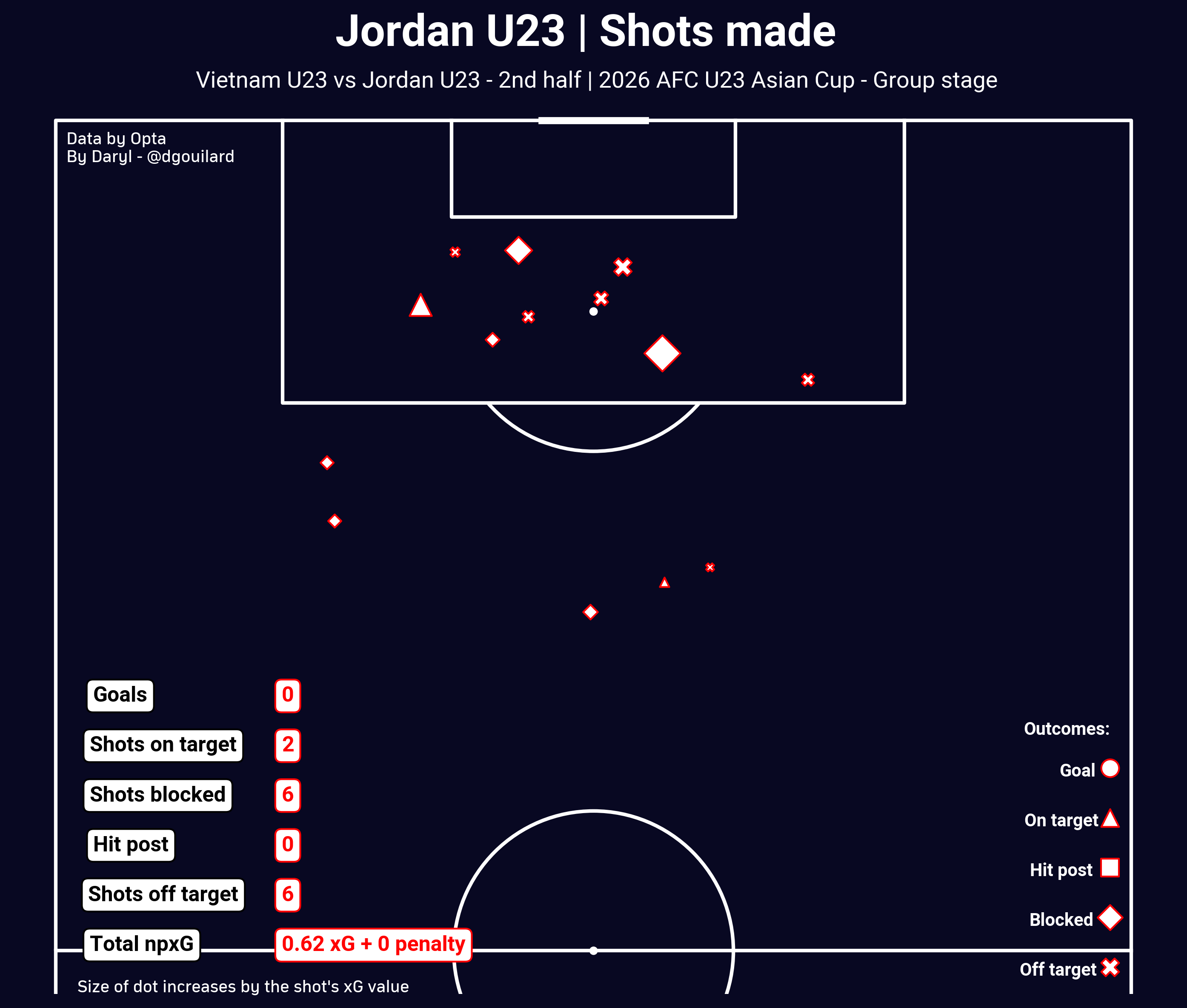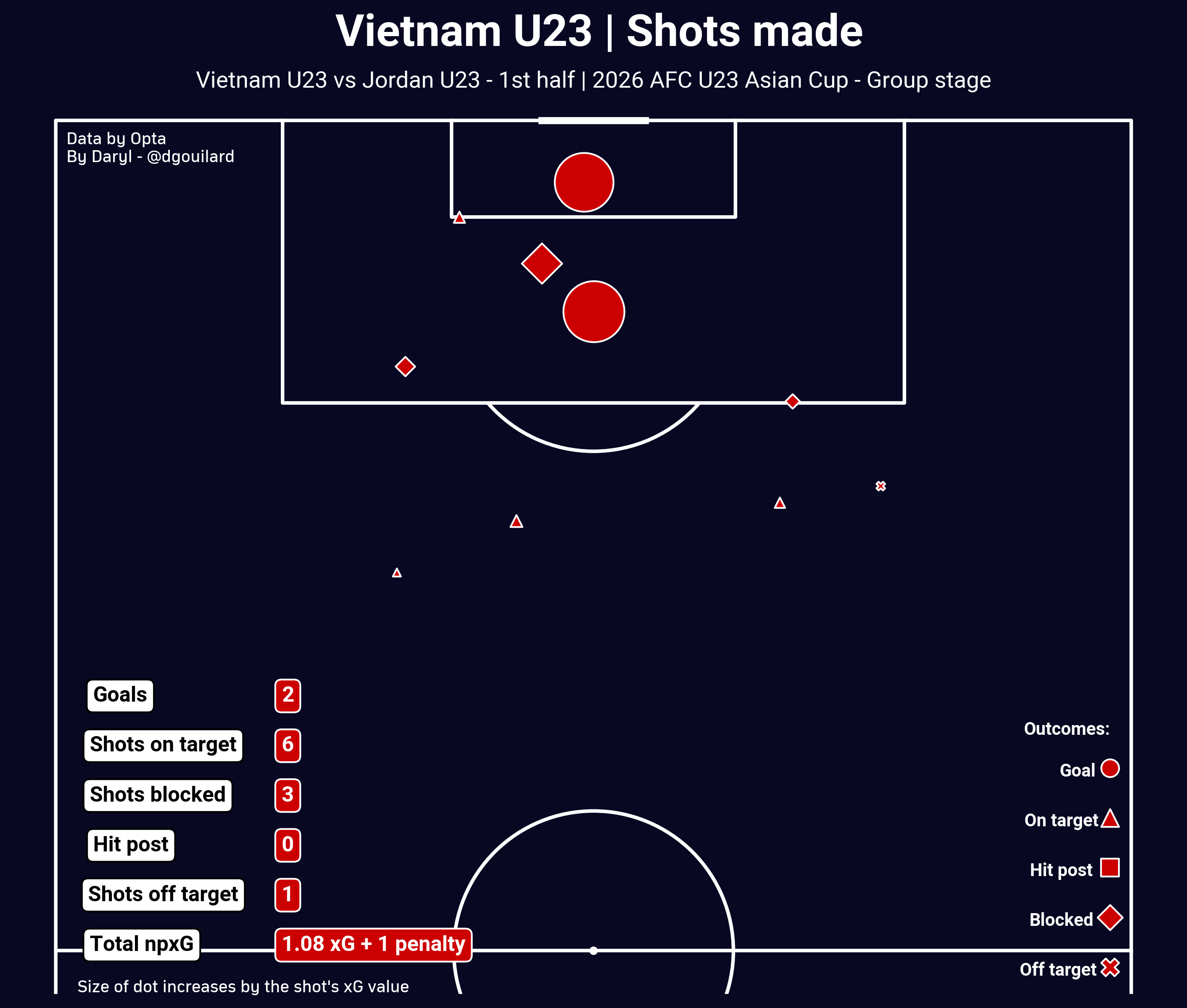 The opening day of the U23 Asian Cup’s latest edition somewhat delivered with two wins for the favourites in Vietnam and Saudi Arabia. But while the scoreline is straightforward to understand, what else can we learn from Vietnam’s performance against Jordan and how convincingly did the Southeast Asian side secure the win? Let’s dive into the data, shall we?