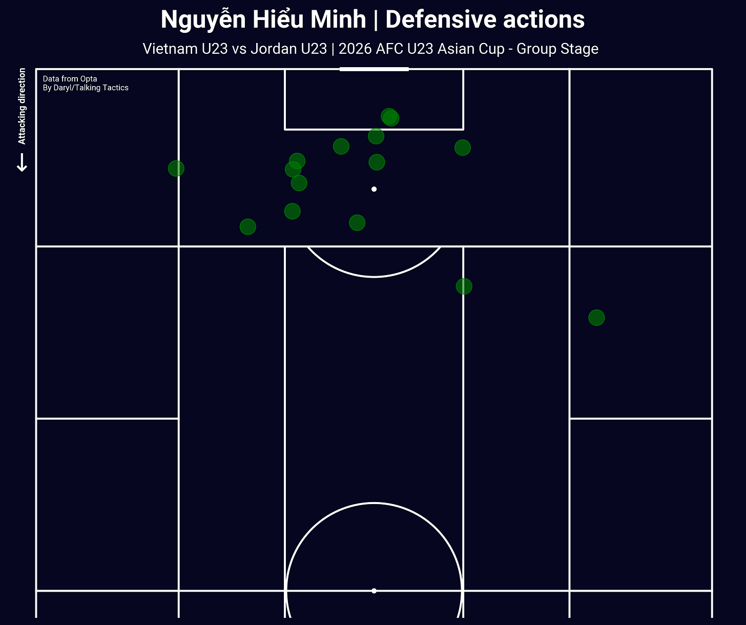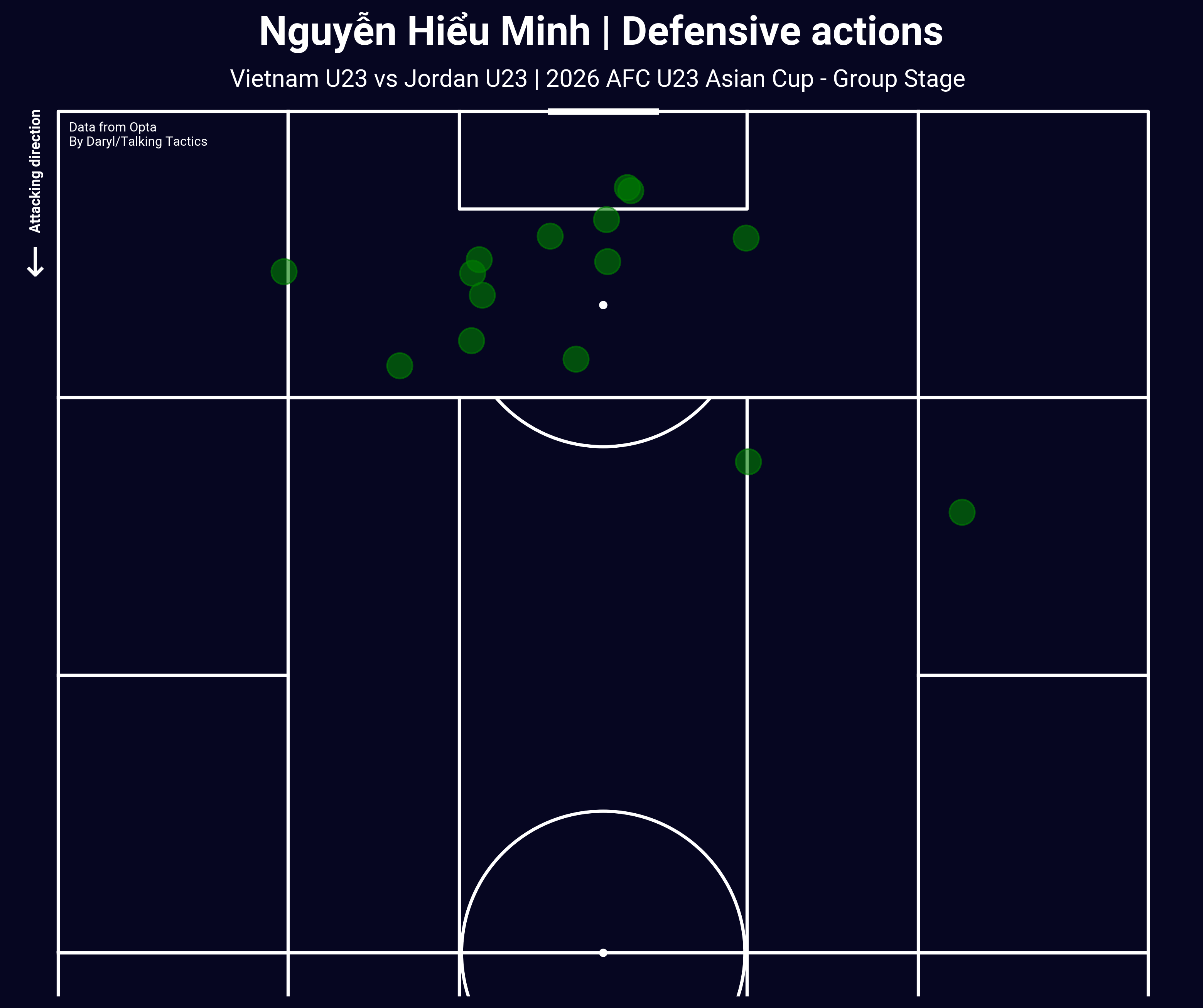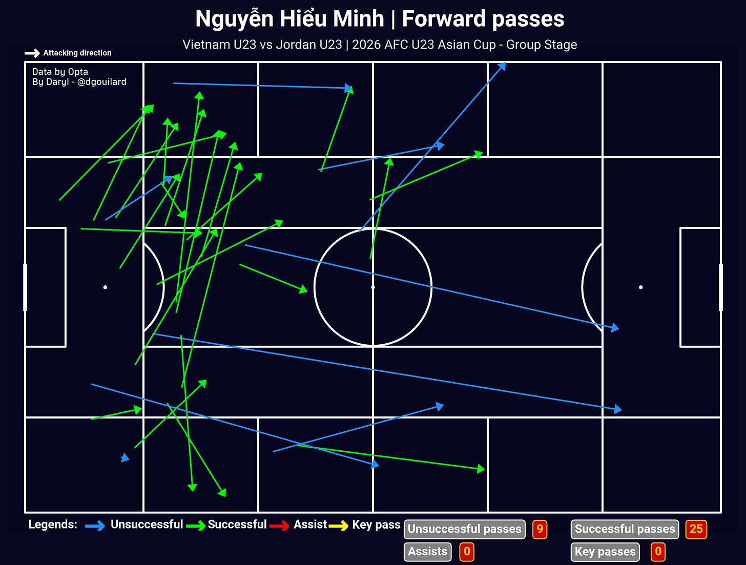 When he had the ball in the first half, Hiểu Minh’s composure was an important factor that helped Vietnam progressed through Jordan’s high press and get the ball to players who were more capable at bringing it forward to the attackers. He also did not shy away from making long passes forward to encourage the front three to make runs in behind either. In total (and proportion), out of Hiểu Minh’s 43 passes, 35 of them (81.4%) were forward passes and 8 (18.6%) were long passes, the most in both categories for all Vietnam’s outfield players. It capped off a very promising performance and put him firmly into my list of players to watch for the rest of the tournament.
