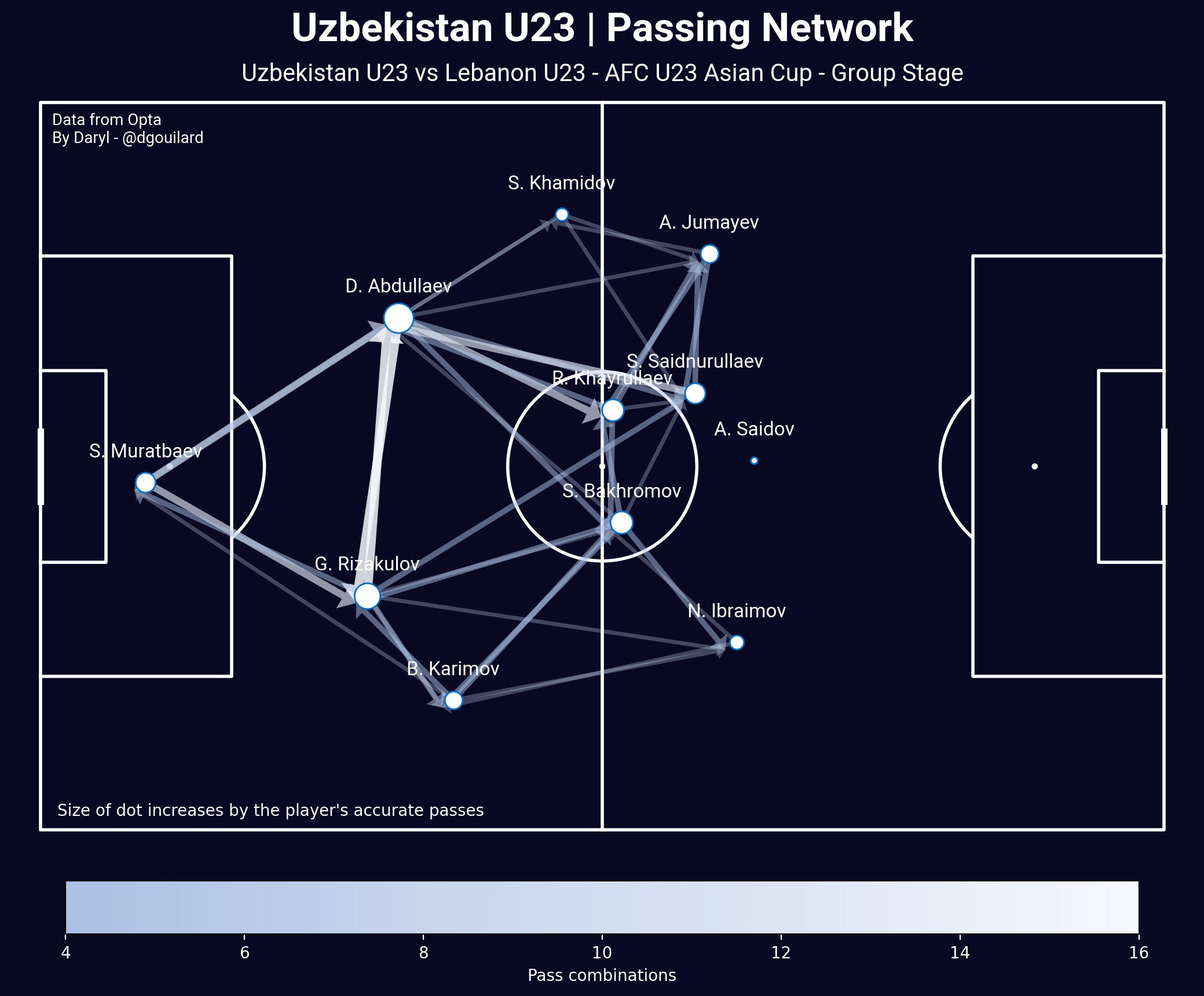 This match was also a match of individual brilliance that saw Uzbekistan’s central midfielder #7 Sardorbek Bakhromov and left winger #11 Asilbek Jumayev left a huge impact on the match. Bakhromov was a key cog in Uzbekistan’s midfield as he appeared both very deep to offer a passing option for the centre-backs and very high up the pitch through his off-ball runs to be the third-man in a passing triangle. His technical ability was very good as it allowed him to receive and control the ball in tight spaces, evaded the pressure from the Lebanese players, then turned to face forward almost immediately. His off-ball runs from the middle of the pitch into the half-spaces were also utilised to its maximum as it allowed Bakhromov to be in advanced positions to create chances for his teammates.