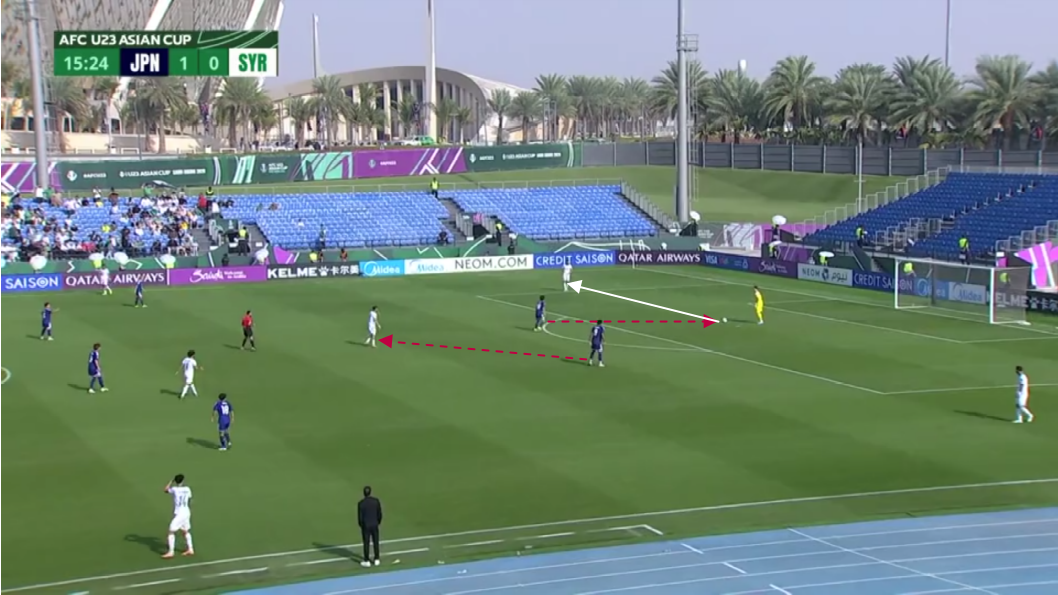 Japan’s preference to attack down the left along with width provided by both the full-back and winger definitely helped brought out Yokoyama’s best ability. Since his starting position tended to be near the touchline, he received the ball wide on numerous occasions and used his confidence to take on the opposition’s defenders and helped the team bring the ball into the final third. I highly recommend looking up Yokoyama’s highlights from this match just to see how confident he was with his dribbles and skills as he caused a lot of troubles for the Syrian defenders.