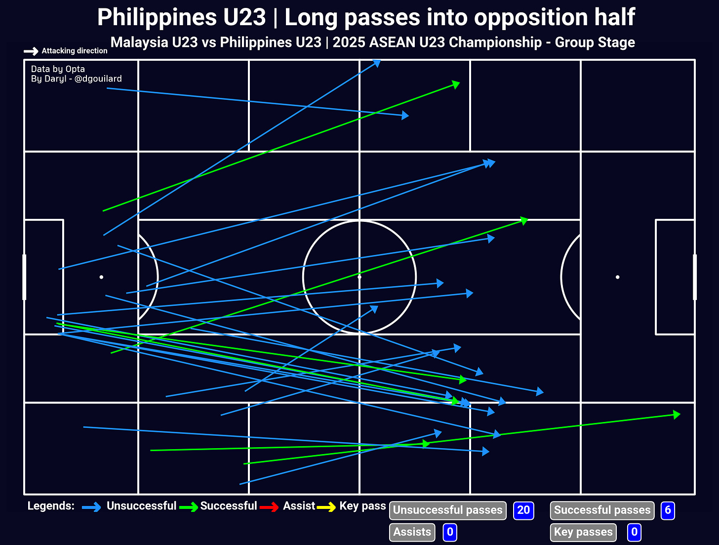 At the other end, while Malaysia showed a lot of frustration by not getting into the right positions to score, the Philippines only needed very few chances to get the result that they wanted. Since they did not have control of the ball for most of the match, McPherson’s side opted to use goal-kicks to their advantage and had Guimarães distribute the ball long from inside the penalty box, quite often finding pacey wingers like Javier Mariona and Uriel Dalapo in behind Malaysia’s high defensive line. If they had only done it a few times, I would have written it off as an individual effort, but the visualisation below showed that it was an intentional decision from Garrath McPherson and his team.