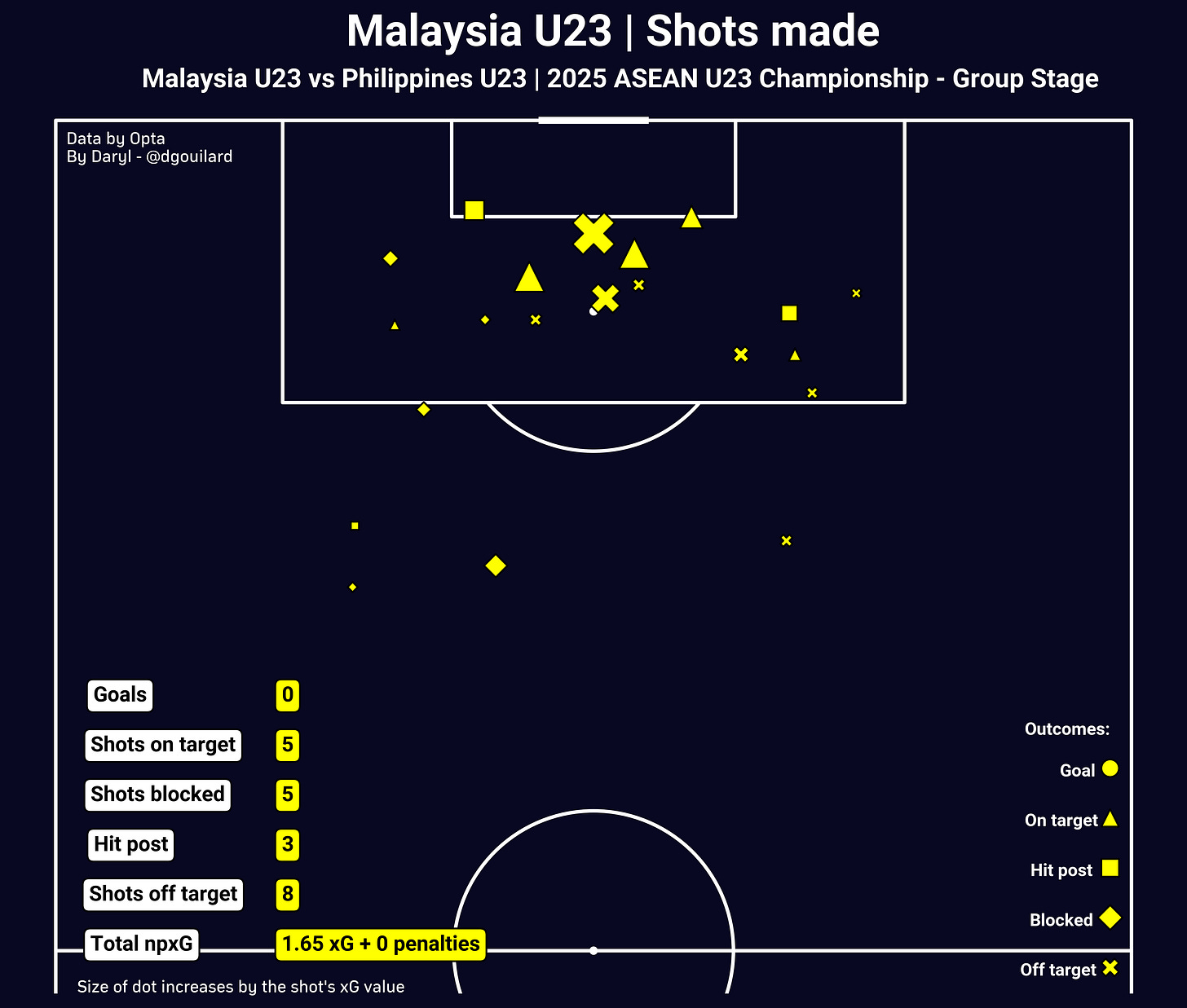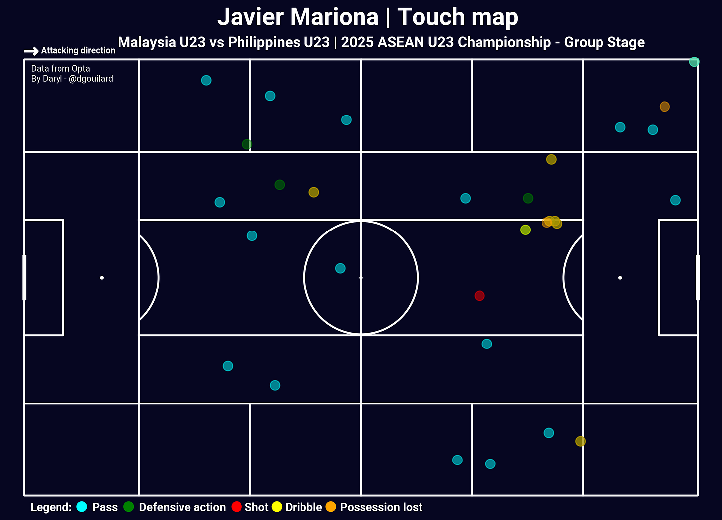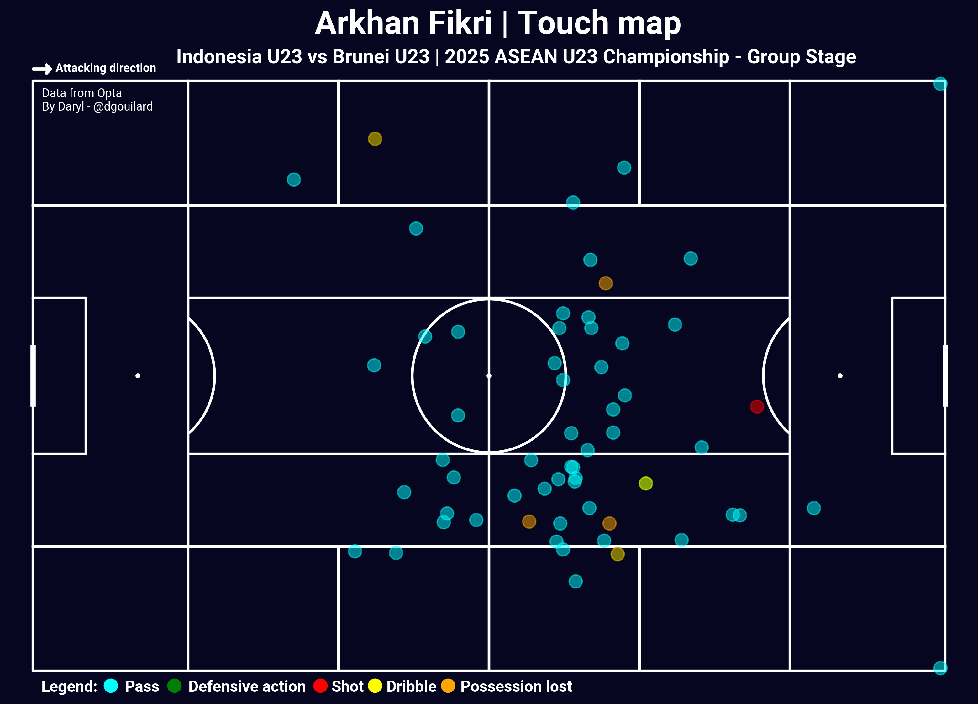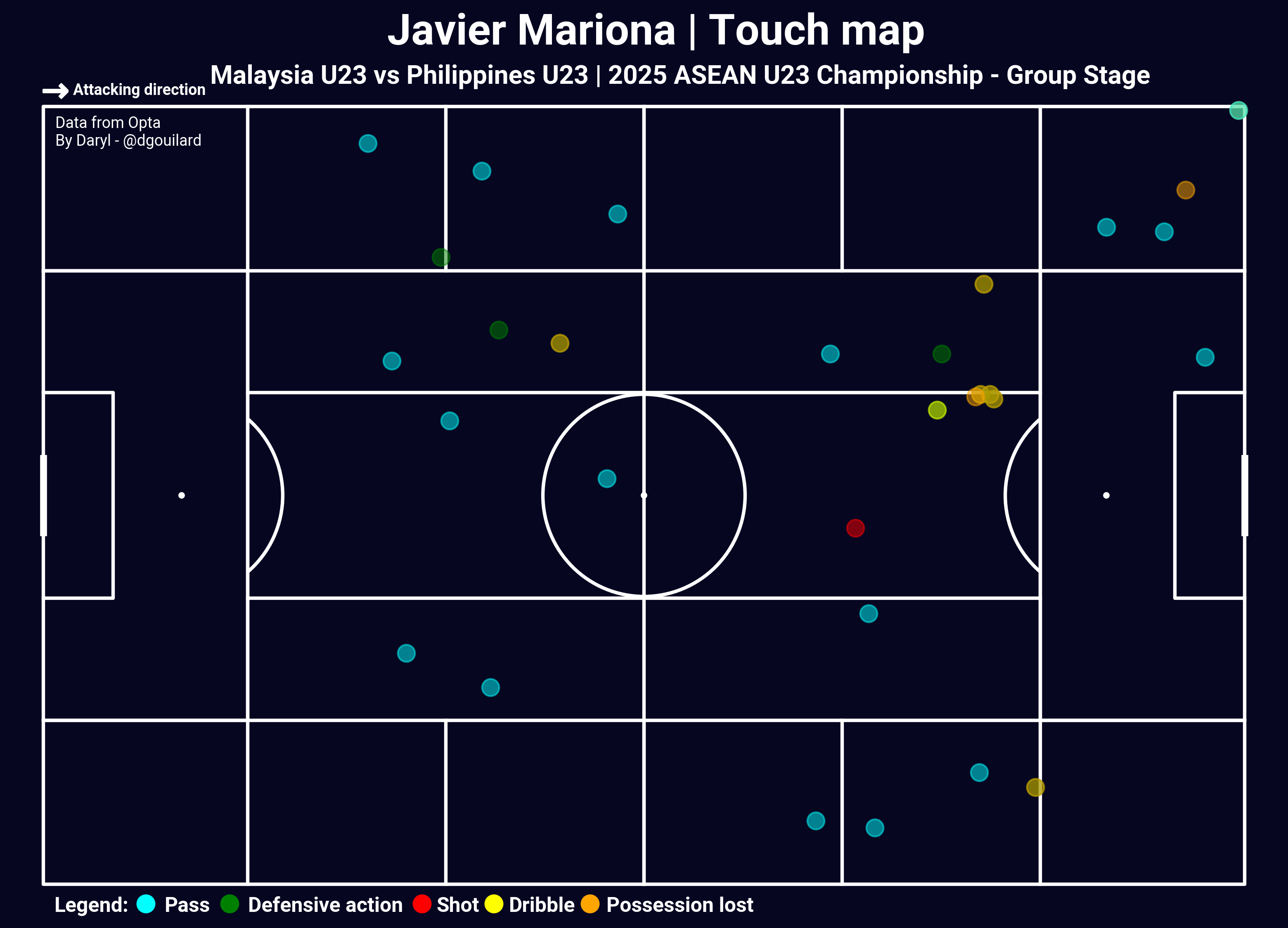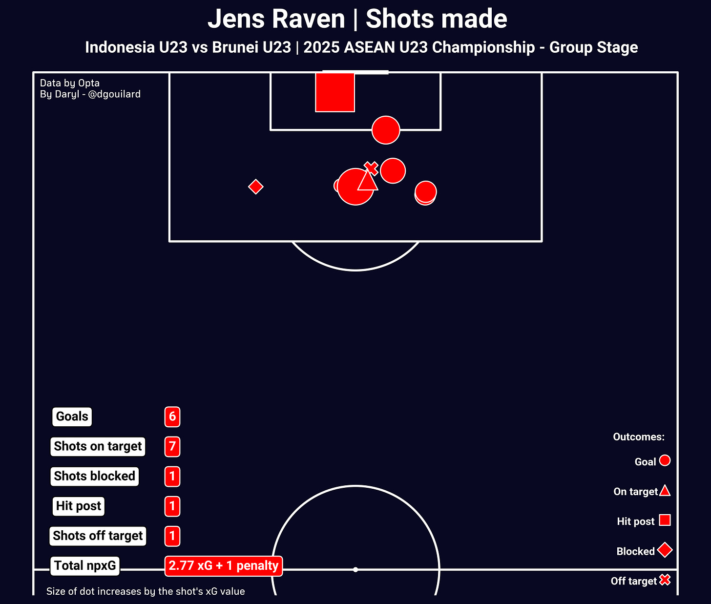 Obviously the spotlight of the night has to go to Indonesia’s Jens Raven. He delivered a performance that was class apart from almost everyone on the pitch, which was expected from a player who was trained in Europe. While his numbers (6 goals from 7 shots on target and from 2.77 non-penalty xG) were already quite impressive, I do not think they tell the full picture of Raven’s performance, which is always one of the downsides of event-level data.