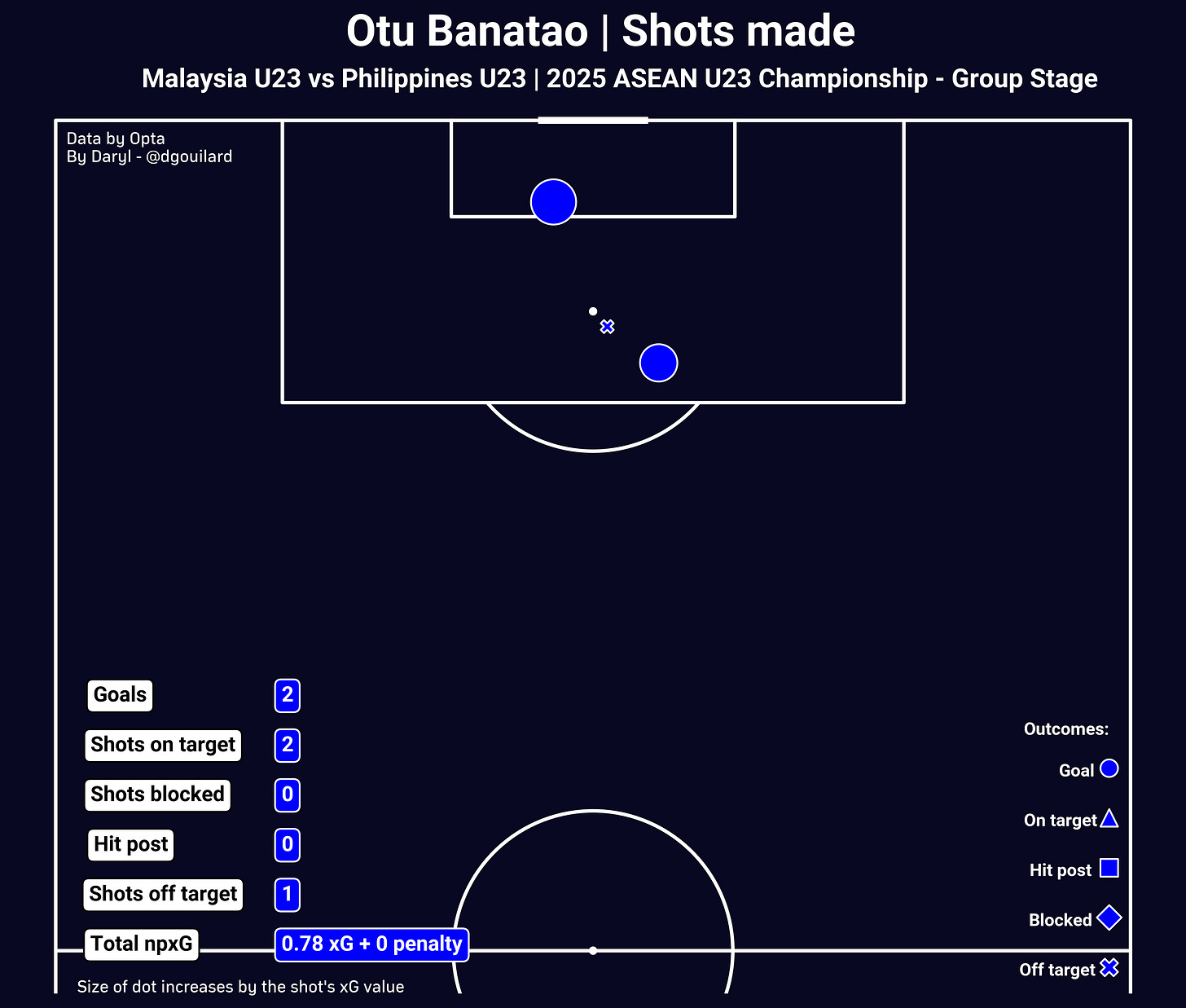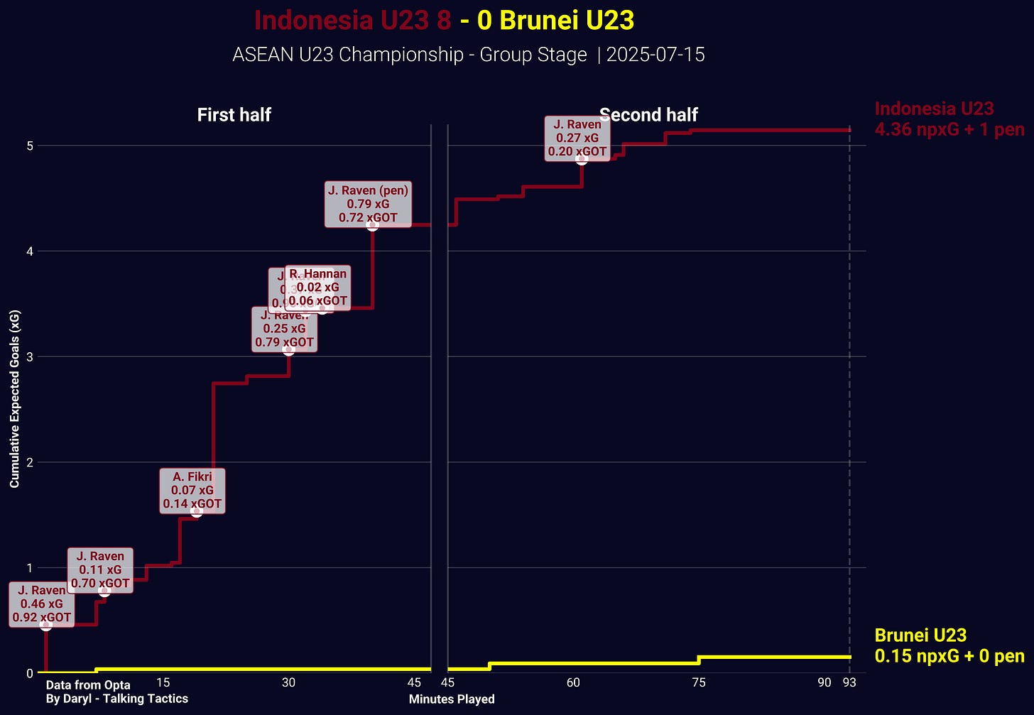 On many occasions, Raven’s off-ball runs freed him from being marked by a Brunei’s defender and allowed him to pick up the incoming cross or through ball inside of the penalty box. Then, his composure whenever he was in a 1v1 with the goalkeeper, which he utilised to bring the ball to his preferred right foot for a more powerful and precise shot. The placement of his shots also made it a lot tougher for the goalkeeper to save them, which is reflected through the fact that none of the Expected Goals on Target (how hard it is to save a shot) of all of his non-penalty goals in the first half (0.923 xGOT, 0.702 xGOT, 0.793 xGOT, 0.902 xGOT respectively) is below 0.7 xGOT, meaning all four non-penalty goals that Raven scored were hard to save.