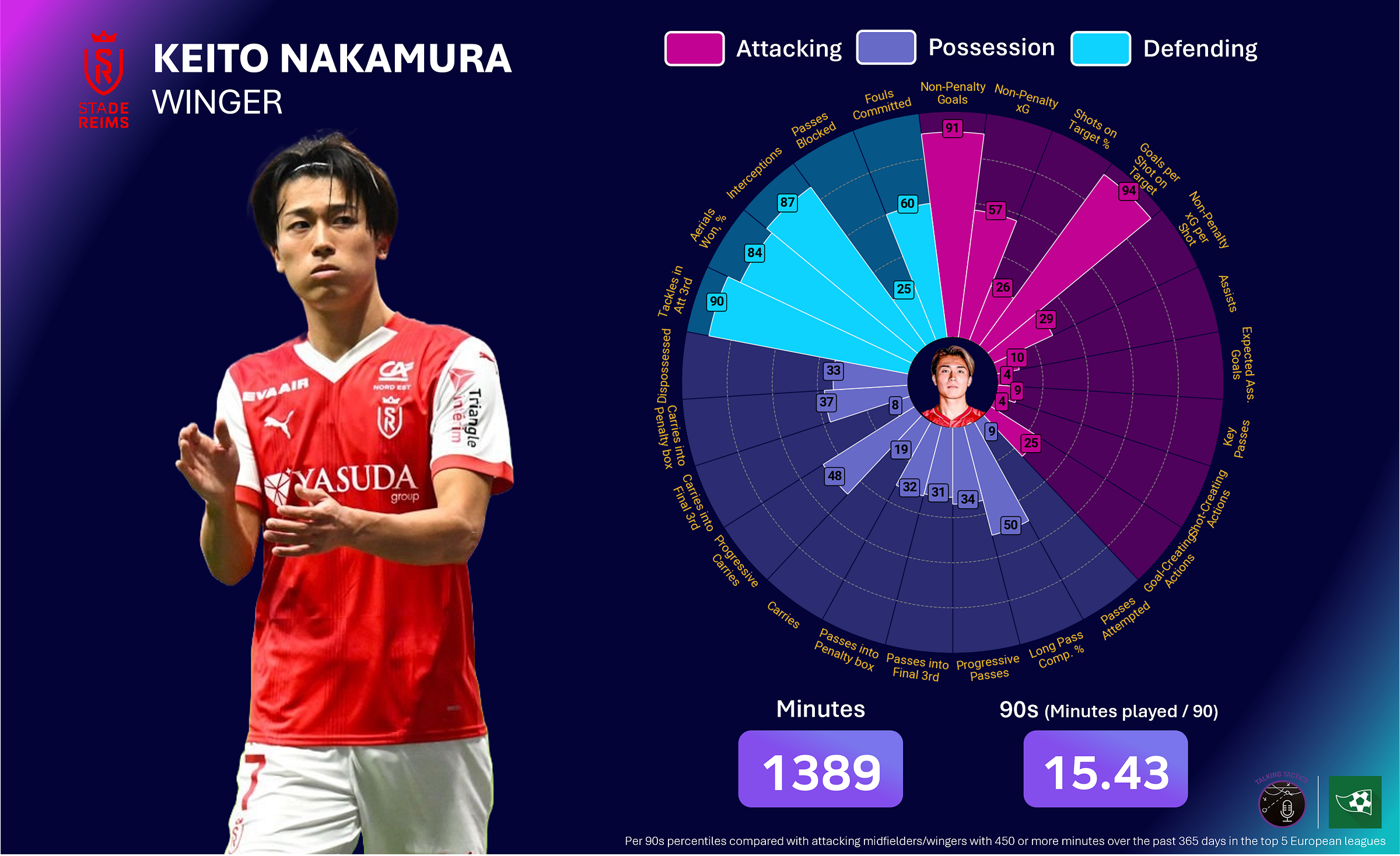 His defensive ability is also reflected on the data with his 90th ranking for tackles in the attacking third and 87th in interceptions. It is an attitude that can work very well in teams that like to press as his reading of the game can help Reims regain possession through interceptions or forced turnovers. It is also surprising to see that Nakamura is ranked 84th for aerial won percentage, highlighting that the Japanese winger can also use his physicality to win long passes coming towards him.