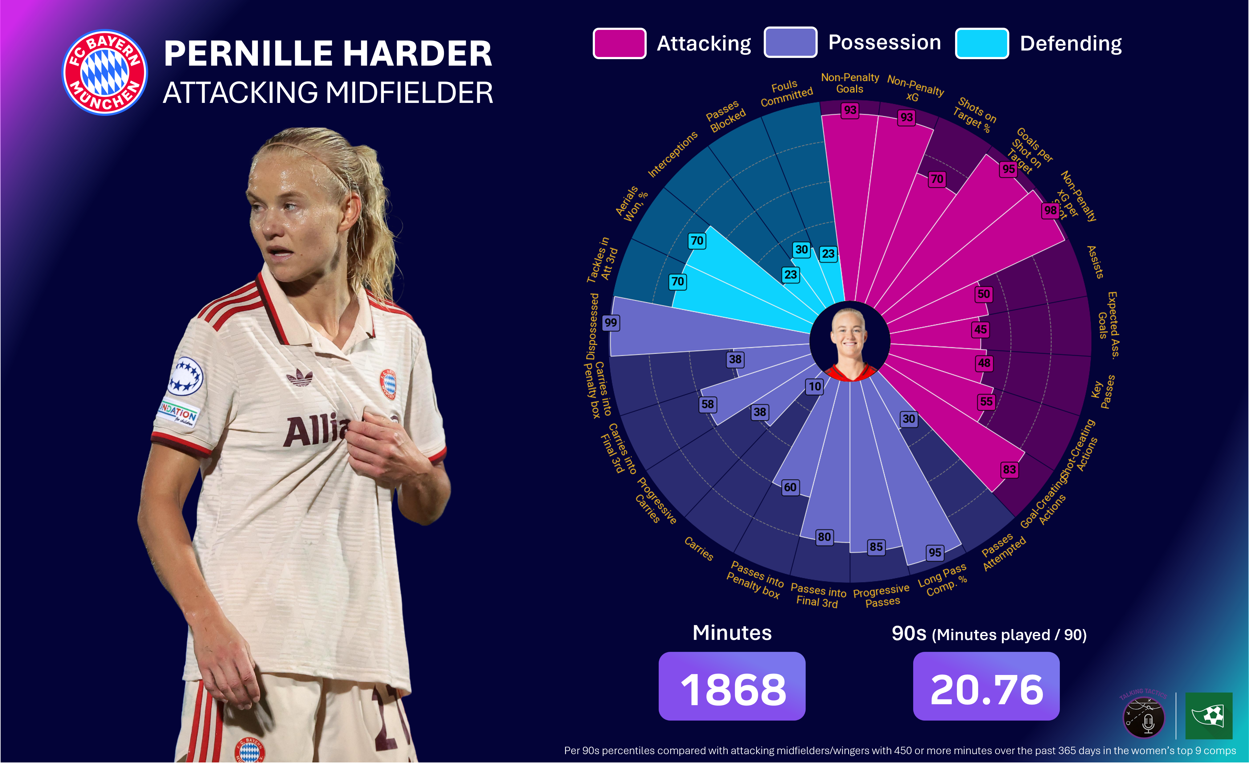 But Harder’s style of play is so much more than being an out-and-out #9. Even though the percentiles for chance creation do not stand out very much, they still highlight Harder’s ability to create chances for teammates and contribute to the team’s build-up play. 50th for assists, 55th for shot-creating actions, 83rd for goal-creating actions, 85th for progressive passes, and 80th for passes into the final third still put Bayern’s #21 up there as one of the best complete forward of women’s football this past few seasons.