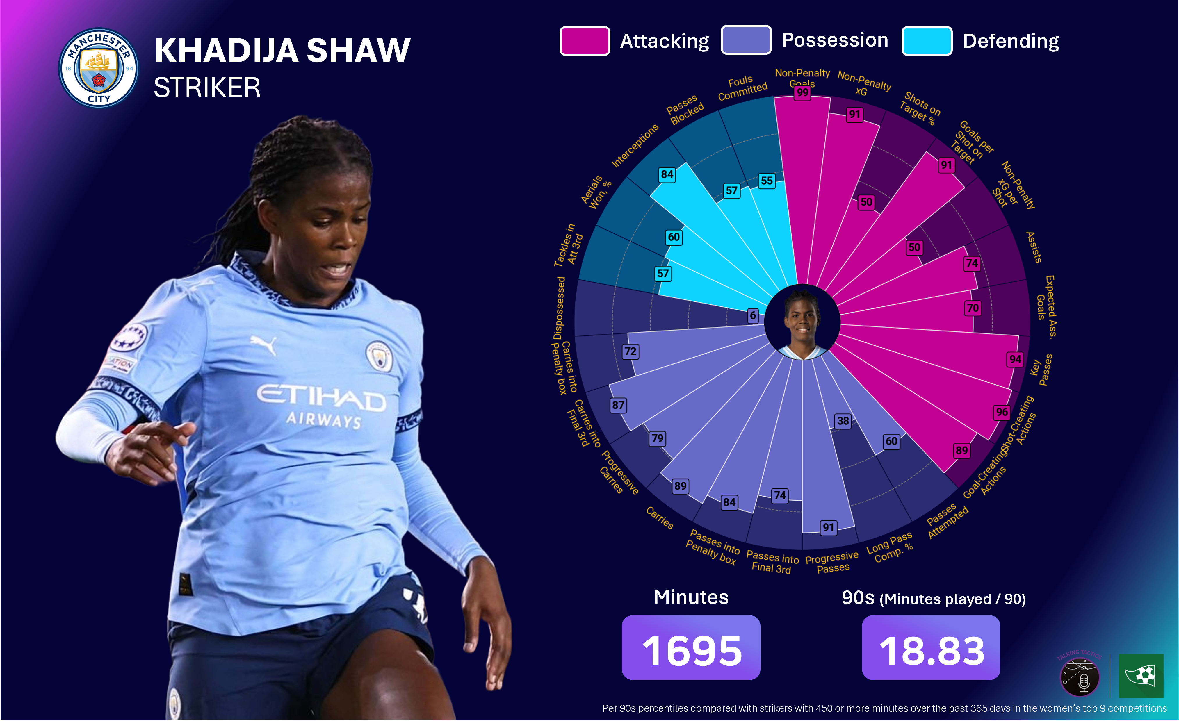 Another striker who is also a complete package for their team, Shaw is being used as an out-and-out #9 for Man City and they are maximising what the Jamaican can do. Offensively, the team benefit by Shaw’s goal-scoring and chances creation ability, while defensively, Shaw brings a willingness to press and regain possession to help the team play with a high-intensity pressing style. There is no doubt that Man City will be relying on Shaw if they want to win the Women’s Super League as they start to aim for new heights, which includes lifting the Champions League title.