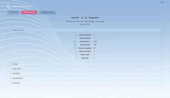 With the Match Analysis page, I treat it as a mini match report where I can quickly view metrics and stats that can give me a decent picture of the match, which opens the floor for more in-depth analysis of both teams or any of the players on the Detailed Analysis page if I want to do so. This is me applying my past experiences as an analyst and putting myself in that same position again, thinking ‘what do I want to know when the match is finished from a data point of view’.