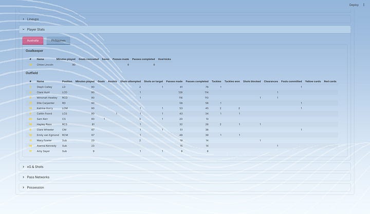 Honestly, my answer to both of those questions is I just don’t want to. In a world with so many public, football-focused Streamlit dashboards being shared on Twitter/X every other week and month, I want to have something to call my own. There are also so many similar dashboards out there already that people can use, like Ben Griffis’ Best 11 Scouting app is a prominent example. I don’t think the football community needs another Streamlit dashboard from me in general, so please support others who are making cool things instead.