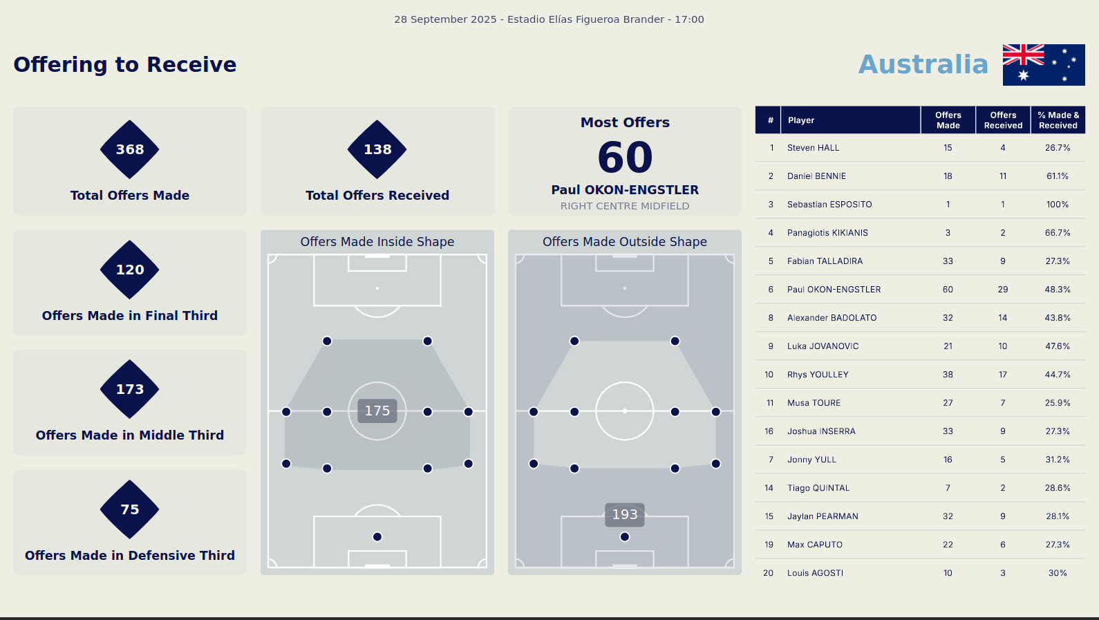 Off-the-ball, his reading of the situation allowed him to position himself in advantageous positions to receive the ball from his teammates and then turned to face forward afterwards. It was very common to spot Okon-Engstler sitting behind or just to the side of the opposition’s attacking line (or strikers line) offering to receive the ball. Once again, this is not a frequent sighting from most young Aussie midfielders playing at a big tournament like the U20 World Cup because there is a sense of nervousness to do so against technically-and/or-physically-superior players, or most players would opt for a back or sideway pass to a centre-back or a full-back who would then play a long ball forward. That is one of the few reasons why I think his playing style is mature and unique because it is just not a common trait found amongst Aussie midfielders unless they go to Europe and get coached to do so on a frequent basis. Once again, FIFA’s data highlighted this trait from Okon-Engstler well as he led the team for number of offers made and received against Italy U20.