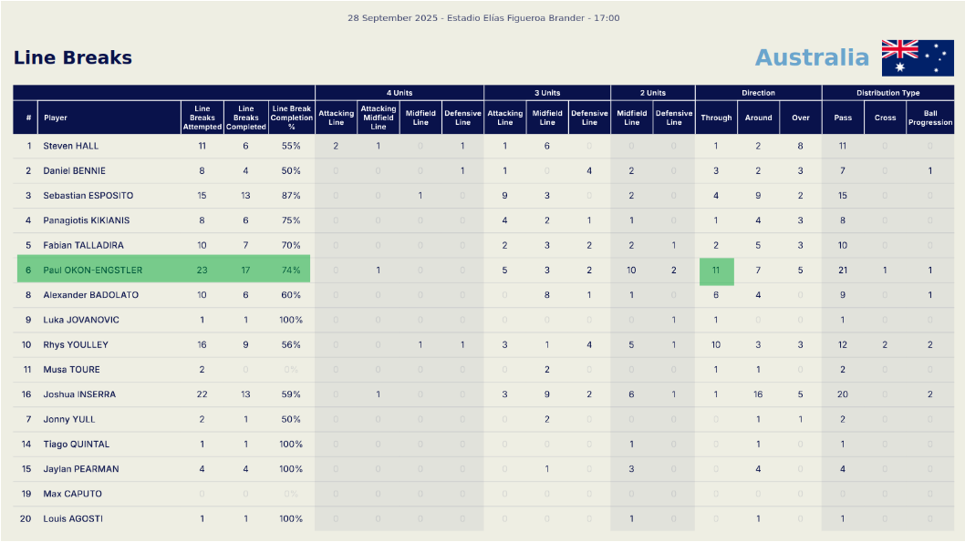 Okon-Engstler’s reading of the game and situation is also good and he has been using that to the full extent. On the ball, it has helped him make line-breaking passes to find teammates in more advanced positions and got the ball out of the build-up phase and into the attacking phase. According to FIFA’s data, 11 out 23 line-breaking attempts from the Young Socceroos’ #6 was through Italy’s defensive block, which highlights Okon-Engstler’s tendency to find teammates who sat in between the opposition’s defensive lines.