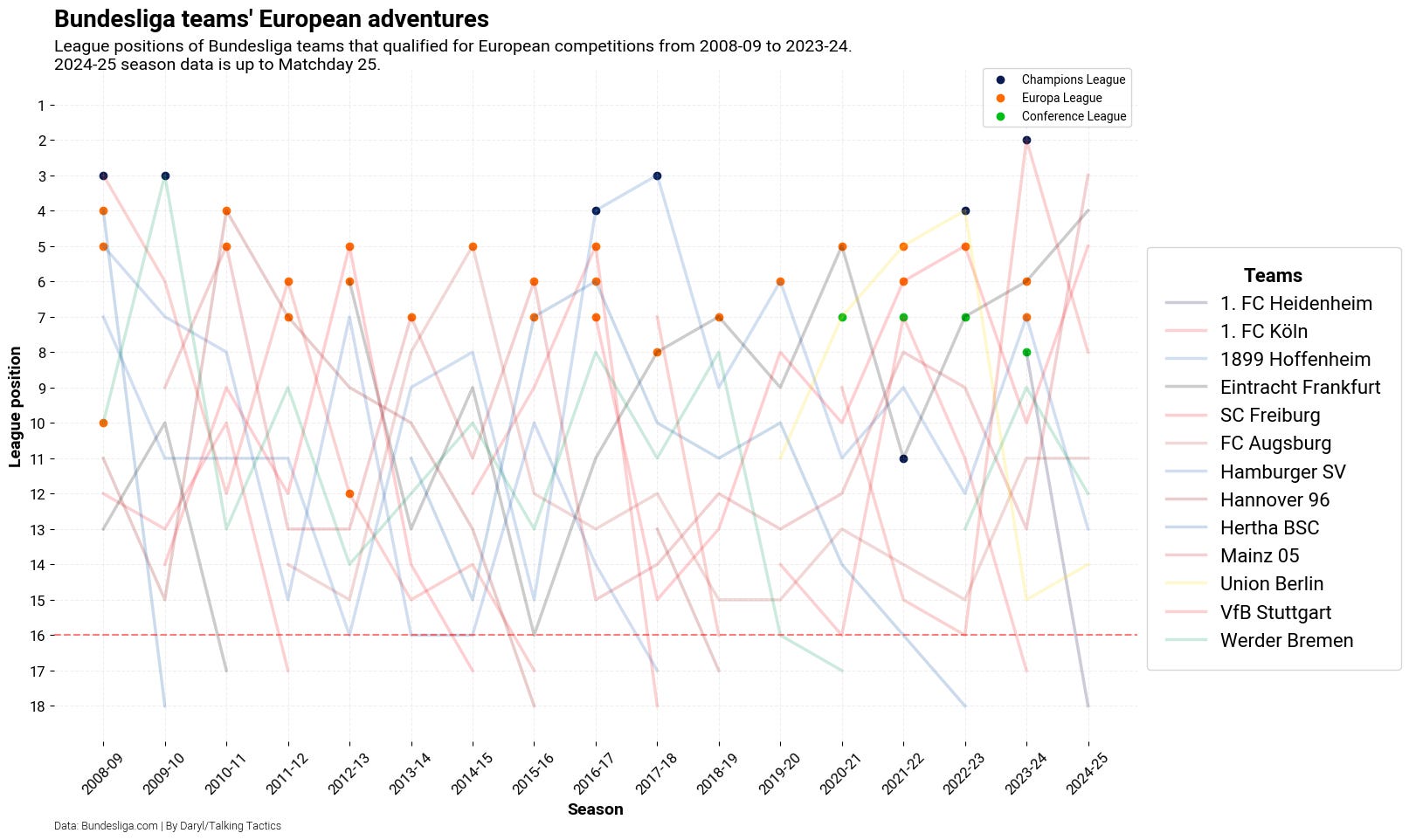 Of these examples that I have listed, only Freiburg and Frankfurt have managed to stabilise themselves and got themselves to a position where they are constantly competing for and securing a European spot every season afterwards. Both clubs have used the revenue from playing in Europe well to reinvest back into their squad with slightly different recruitment strategies, which have turned that inconsistent revenue stream from UEFA to a consistent stream, thus providing a solid foundation for both Freiburg and Frankfurt to be competitive every year.