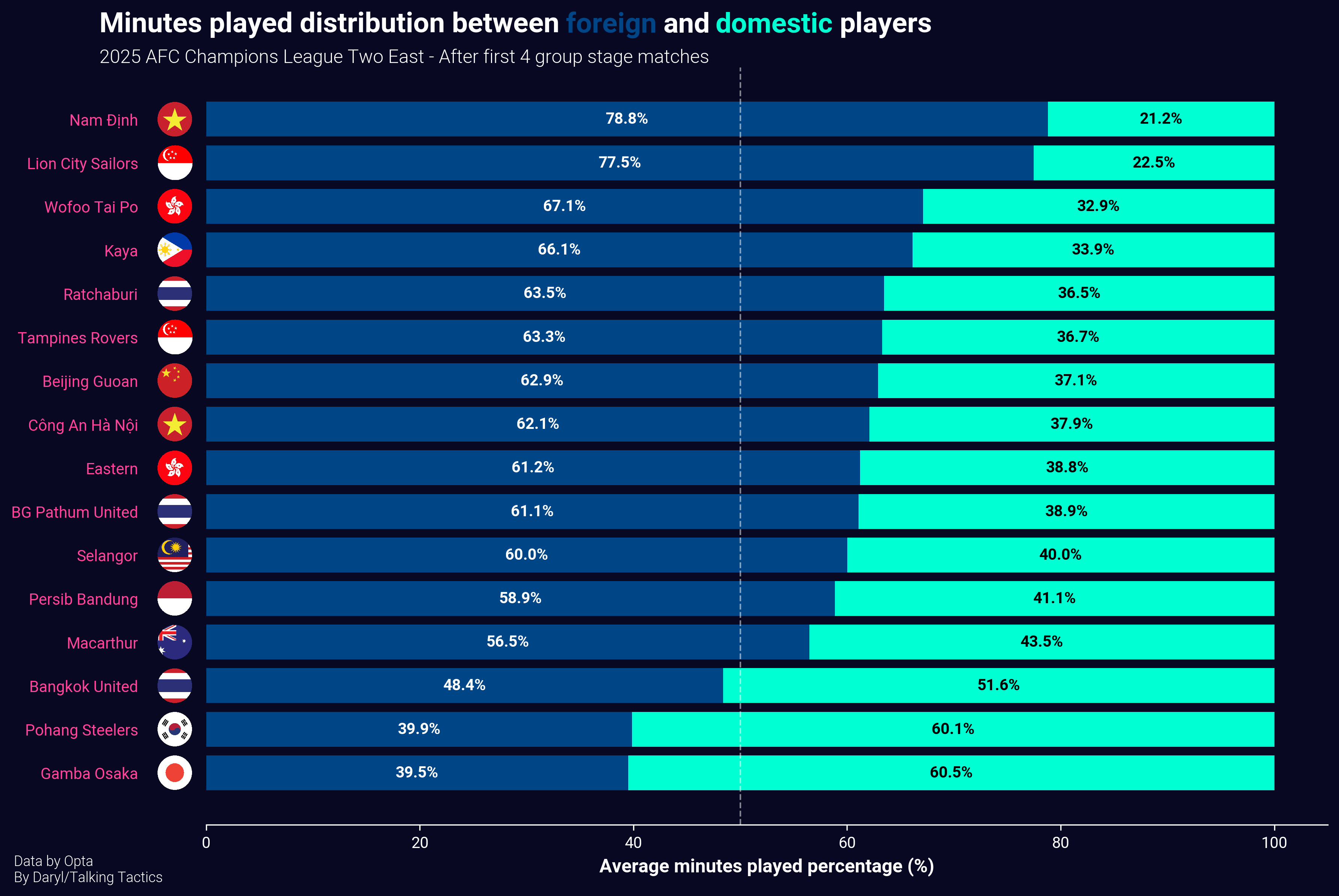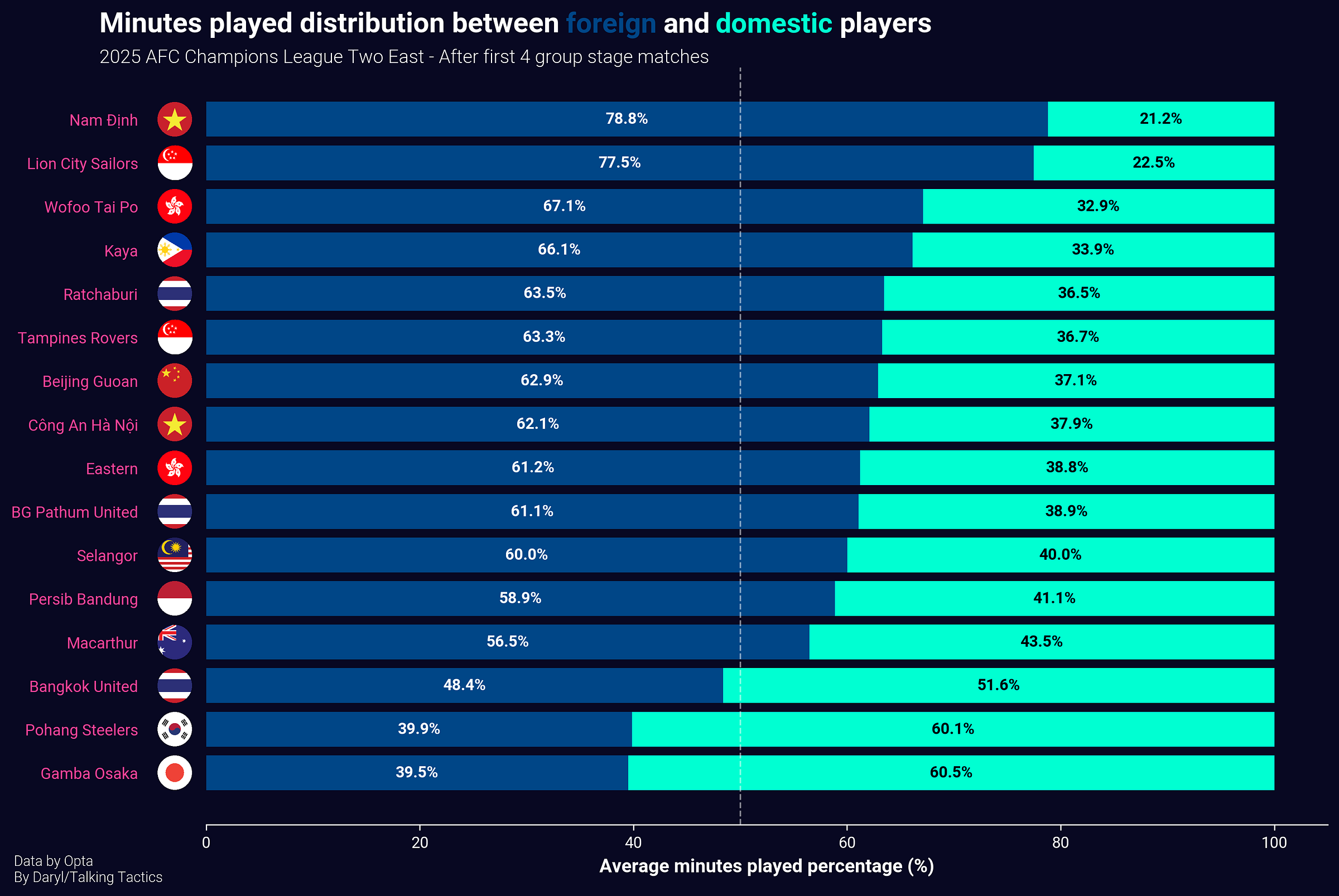 While Eastern Asian clubs have always relied on the quality of foreign players in past Champions League seasons, this year has seen an unprecedented rise, with both Nam Dinh and Lion City Sailors leading the way in average minutes played percentage by foreign players. The two aforementioned clubs are somewhat outliers as foreign players took up more than 70% of their average minutes played, but the average for most Eastern Asian clubs is still on the high end, around 63%.